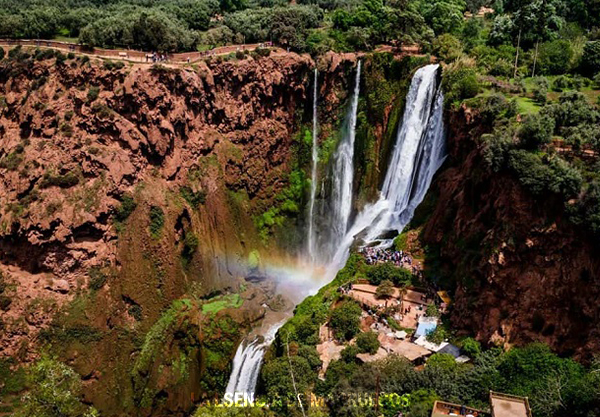 A la hora acordada, nuestro chófer os esperará en el punto indicado, y nos dirigiremos hacia el noreste, dirección a las majestuosas cascadas de Ouzoud. Estas, reciben su nombre de los olivos de la zona, ya que la palabra “Ouzoud” significa olivos en Amazigh. Durante el trayecto haremos algunas paradas para conocer algún pueblo. y al llegar os dejaremos en la plaza principal, y si os dirigís hacia la derecha podréis acceder al camino que va a la parte superior de la cascada, donde hay un camino para observar los macacos , moviéndose entre la floresta. En la cima de las cascadas podremos encontrar diversos molinos de grano antiguos, los cuales siguen en uso a día de hoy. Para descender a la parte del estanque, podéis hacerlo por la parte izquierda de la plaza, es de fácil acceso, y para bajar hay una escalera y un camino bordeado de olivos. La fuerza del agua al caer sobre la tierra levanta una nube de espuma, que a la luz del sol se iluminan con un arco iris permanente. Después de precipitarse con tanta fuerza, el río parece tomarse un descanso, se aquieta y forma estanques de aguas tranquilas, piscinas naturales donde podrás disfrutar las delicias de un refrescante baño, o también podéis alquilar uno de los pequeños botes para llegar a los estanques o cruzar a la otra orilla añadiendo al paseo un encanto más. En la cima de las cataratas, cerca del impresionante golfo, se encuentran una docena de molinos de grano antiguos, que aún están en funcionamiento gracias al agua del torrente